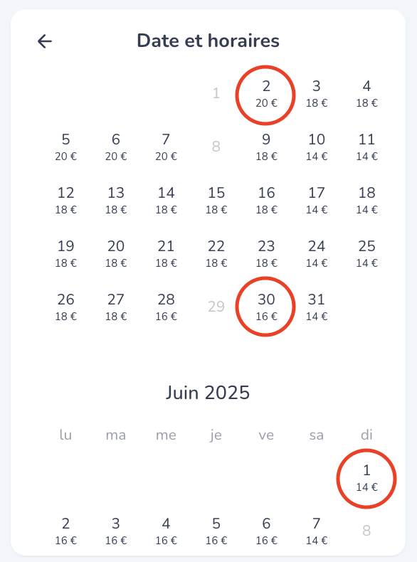 Exemple d’affichage des tarifs selon les heures et les jours de réservation. Les prix incluent déjà toutes les remises applicables.