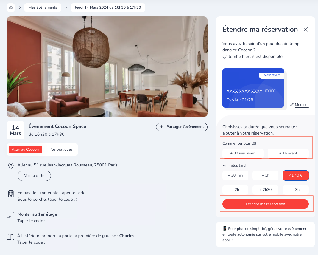 Chez Cocoon, vous pouvez prolonger votre réservation en quelques clics, que ce soit avant le début ou après la fin de votre évènement.